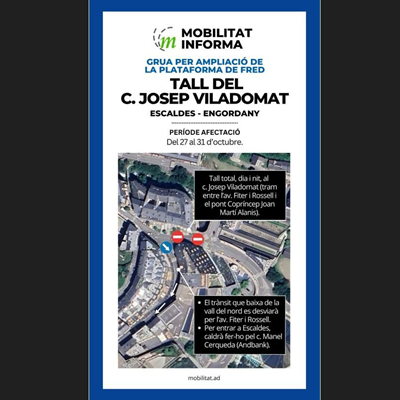 tall del C/ Josep Viladomat, a l'alçada del pont Copríncep Joan Martí Alanis, d'Escaldes-Engordany, per l'emplaçament d'una grua. - Període d'afectació: 27 al 31 d'octubre - El trànsit procedent de la Vall del Nord es desviarà per l'Av. Fiter i Rossell. |